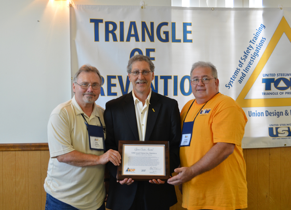 Local Union 9-675 at the 3M plant in Guin, Ala., accepts the 2017 Glenn Erwin Award. (L-R) Mike Harris, shop union representative in 3M’s Additives and Materials Department; John Scardella, program administrator for the Tony Mazzocchi Center, and Milton Simmons, LU 9-675 TOP representative for the 3M site. Photo by Mike Hancock, LU 9-562 retiree.