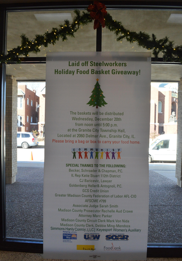 Working in partnership, SOAR, USW Locals 1899, 50, 1063, 68, the United Way our friends from local law firms combined efforts with many Madison and St. Clair County elected officials in the shared desire to give back to those in need during the Holiday Food Basket Giveaway for laid off steelworkers in Granite City, Il.