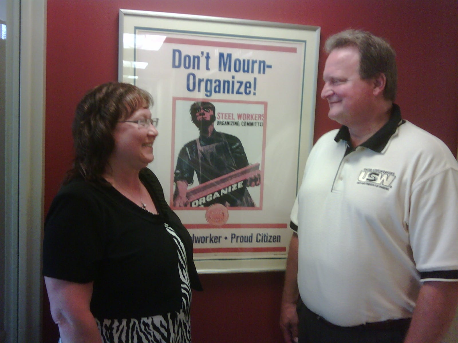 FIGHTING FOR WORKER RIGHTS — Faith Clark (left), the lead organizer in a USW organizing campaign at her workplace of Rescar Inc. in Dubois, PA, testified Jul. 19, 2011 before the NLRB in Washington DC about being fired after the 2008 campaign. Phil Ornot (right), USW Pennsylvania staff organizer, joined her at the hearing to support proposed new rules for speedy elections so workers have a fairer process to win union representation and stop employer delay tactics. Rescar said Clark was a supervisor, but lost claim in NLRB hearing that was a tactic delaying election for several months.