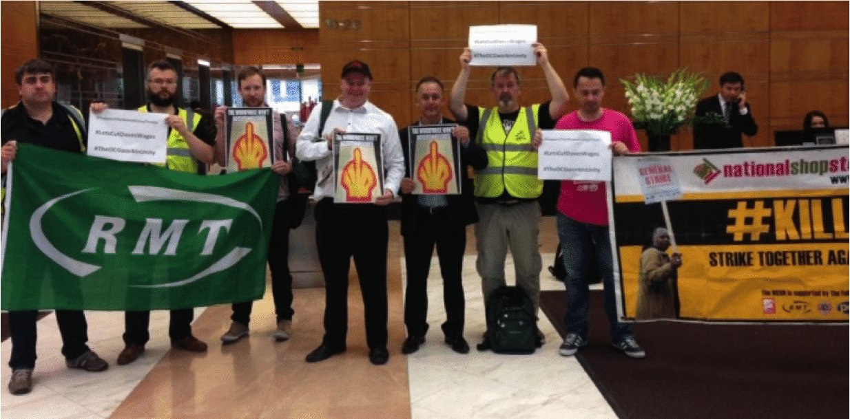 In 2015, a Workers Uniting delegation showed international solidarity with a rally outside the International Petroleum Week dinner in London where Shell CEO Ben van Beurden was a speaker.