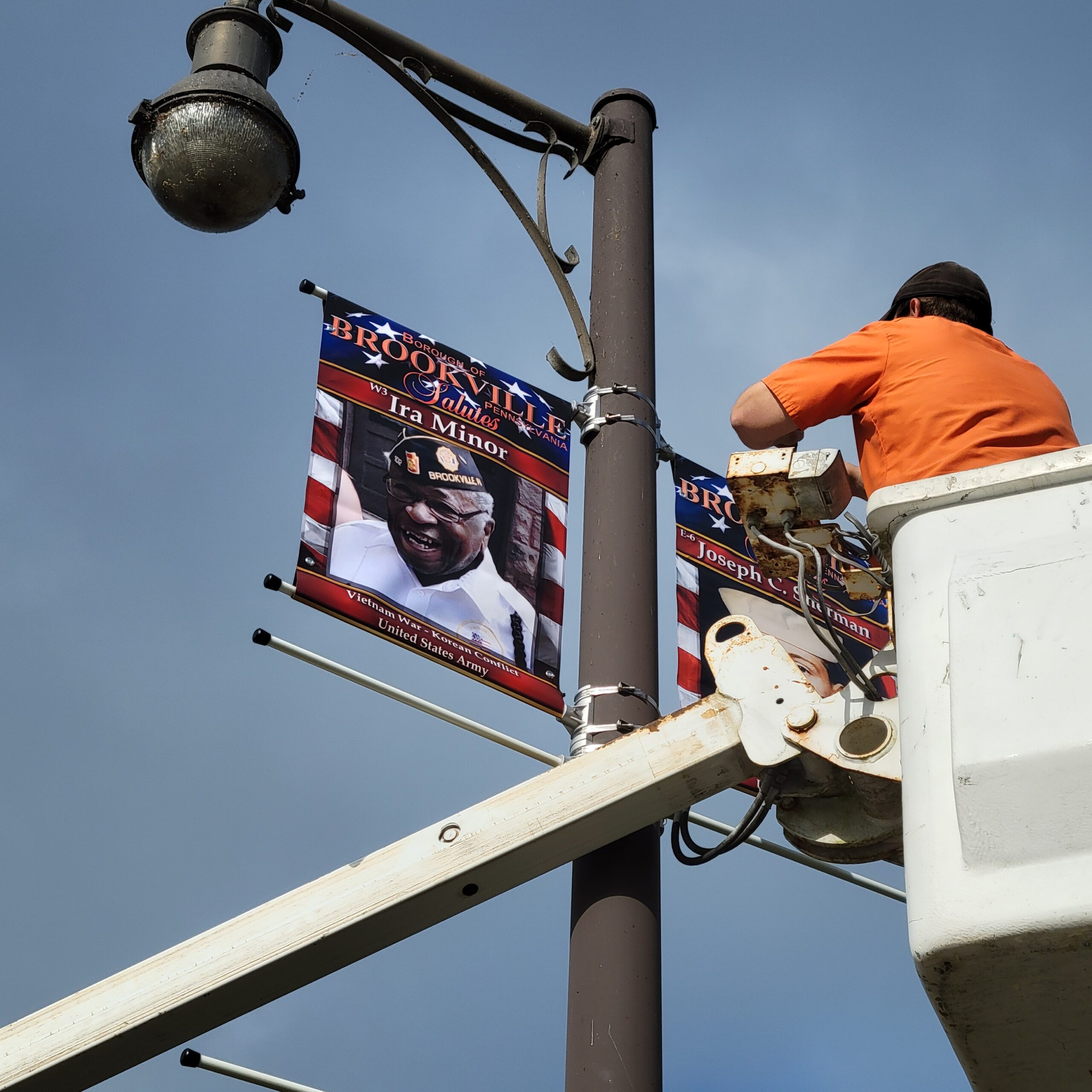 Murray ordered and assembled all of the hardware for the banners to be hung on the polls; Brad Greeley, Brookeville Burrows Maintenance Department, and Silverado Tree Service all volunteer their time and man-power for installation.