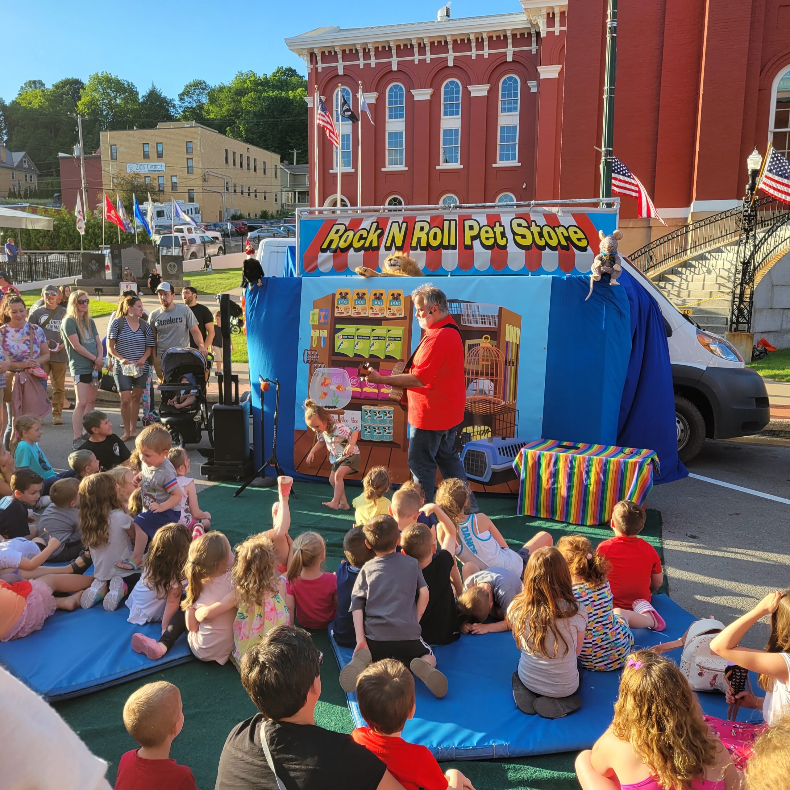 Day four is Family Fun Night: On this day there’s a “Pet Parade” and the kids’ Laurel 500 race where for a small donation the kids can paint wooden cars provided by the Free Masons and then race them; the kids get trophies. There’s “Hungry Human Hippo,” a dunking booth for the police force, a penny booth ring-on-pop-bottle toss run by the firefighters, bubble pit and bouncy houses for the kids, and it all ends with a family movie night on Main Street. The street is shut down, a huge movie screen is put up and give popcorn