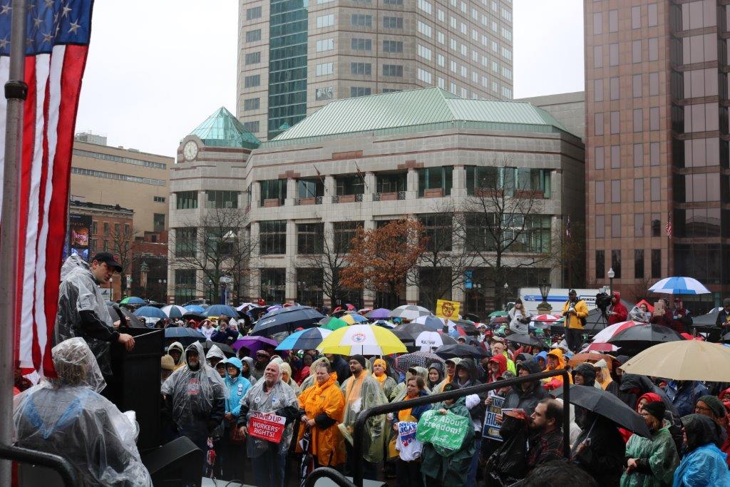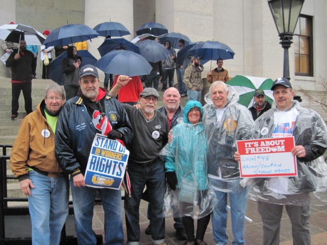 Part of a series of union-led rallies, an estimated 3,500 unionists and supporters braved a constant downpour of rain to rally at the Ohio statehouse on Saturday, February 24, standing up for worker’s rights, just two days prior to when the Supreme Court would hear the anti-union Janus vs. AFCSME case.