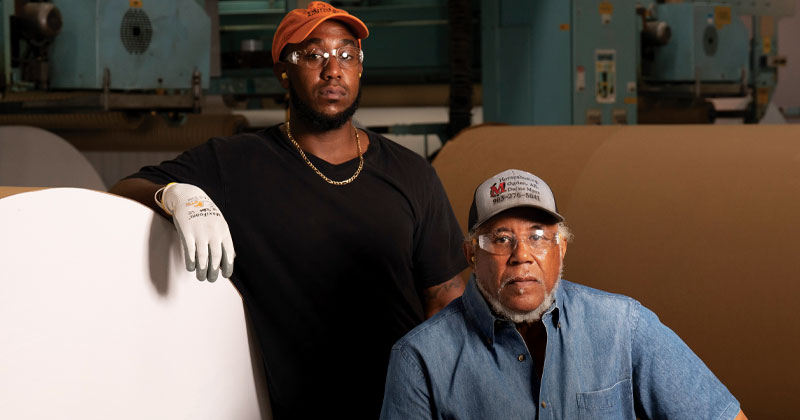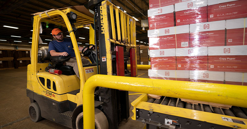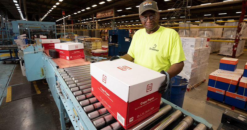 As reams of office paper roll off the converter lines, USW members like Michael Martin conduct periodic audits to inspect the sheets for defects like wrinkles or discoloration, and then make the necessary adjustments.