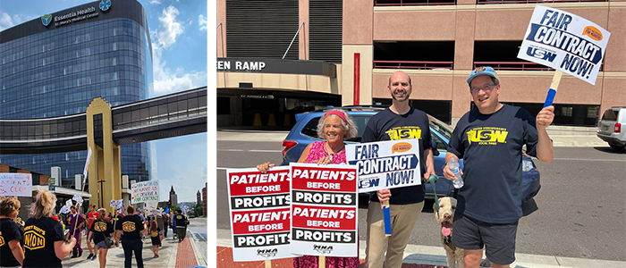 Members of Local 9460 rallied outside St. Mary’s Medical Center in Duluth, Minn., on Friday, July 21, as they remain in tough bargaining with Essentia Health.