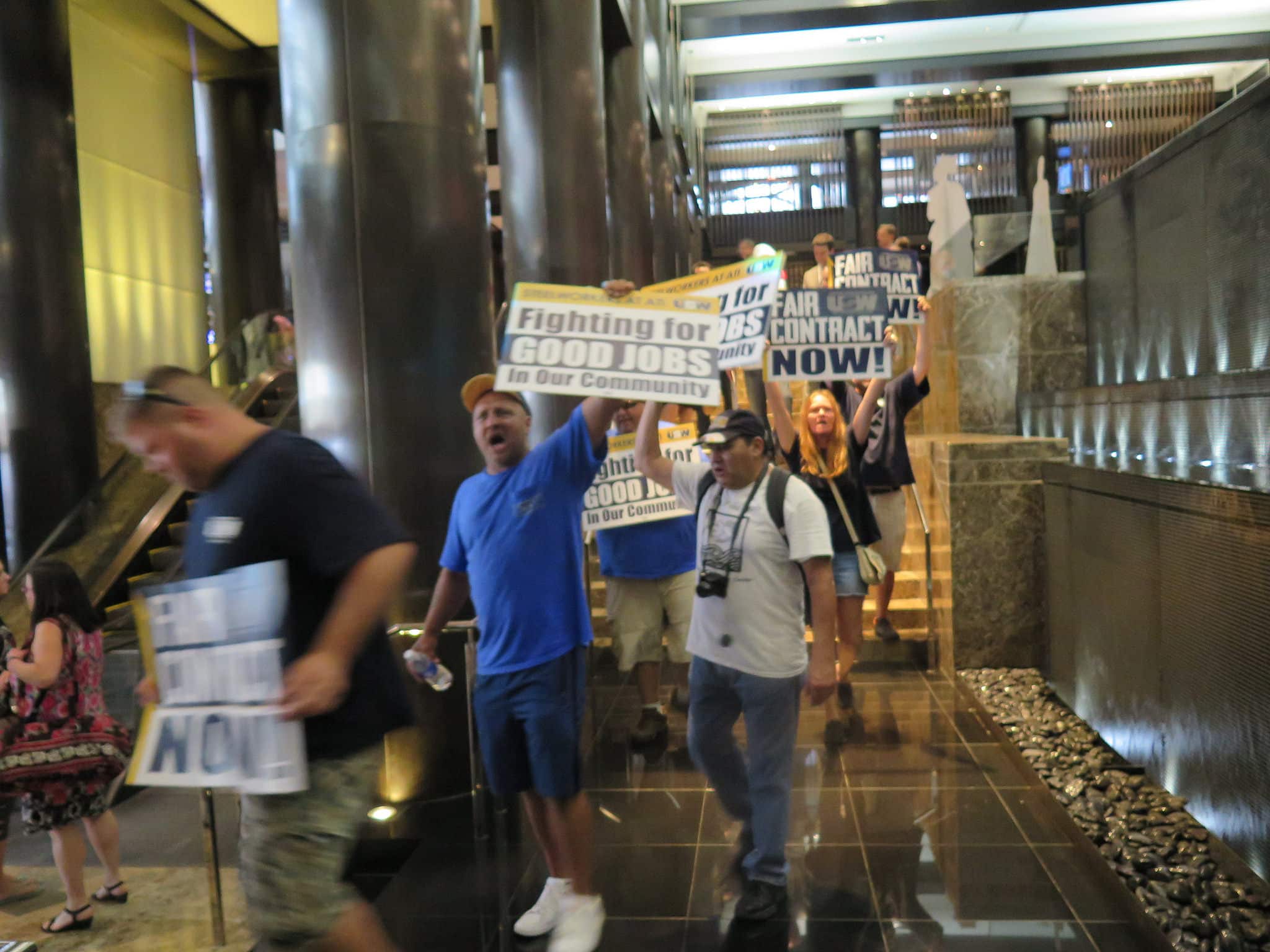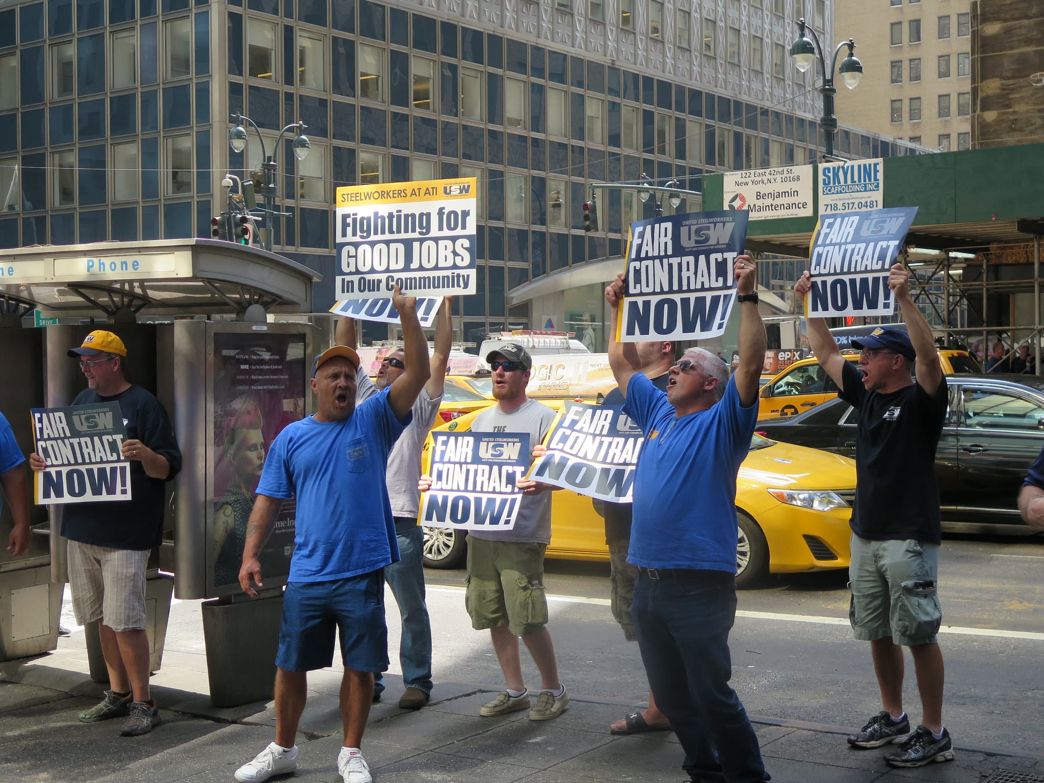 About 50 Steelworkers who have been looked out at Allegheny Technologies (ATI) since August 15 traveled to New York City to confront ATI executives at the Gabelli & Company’s 21st Annual Aircraft Supplier Conference. ATI had previously issued a press release indicating that its Vice President, Dan Greenfield, would be speaking to investors at the event, but the company, and the event organizers kept the location and time of the conference a secret. Locked out Steelworkers were able to track down the ATI executives and the conference at the Grand Hyatt in New York City.