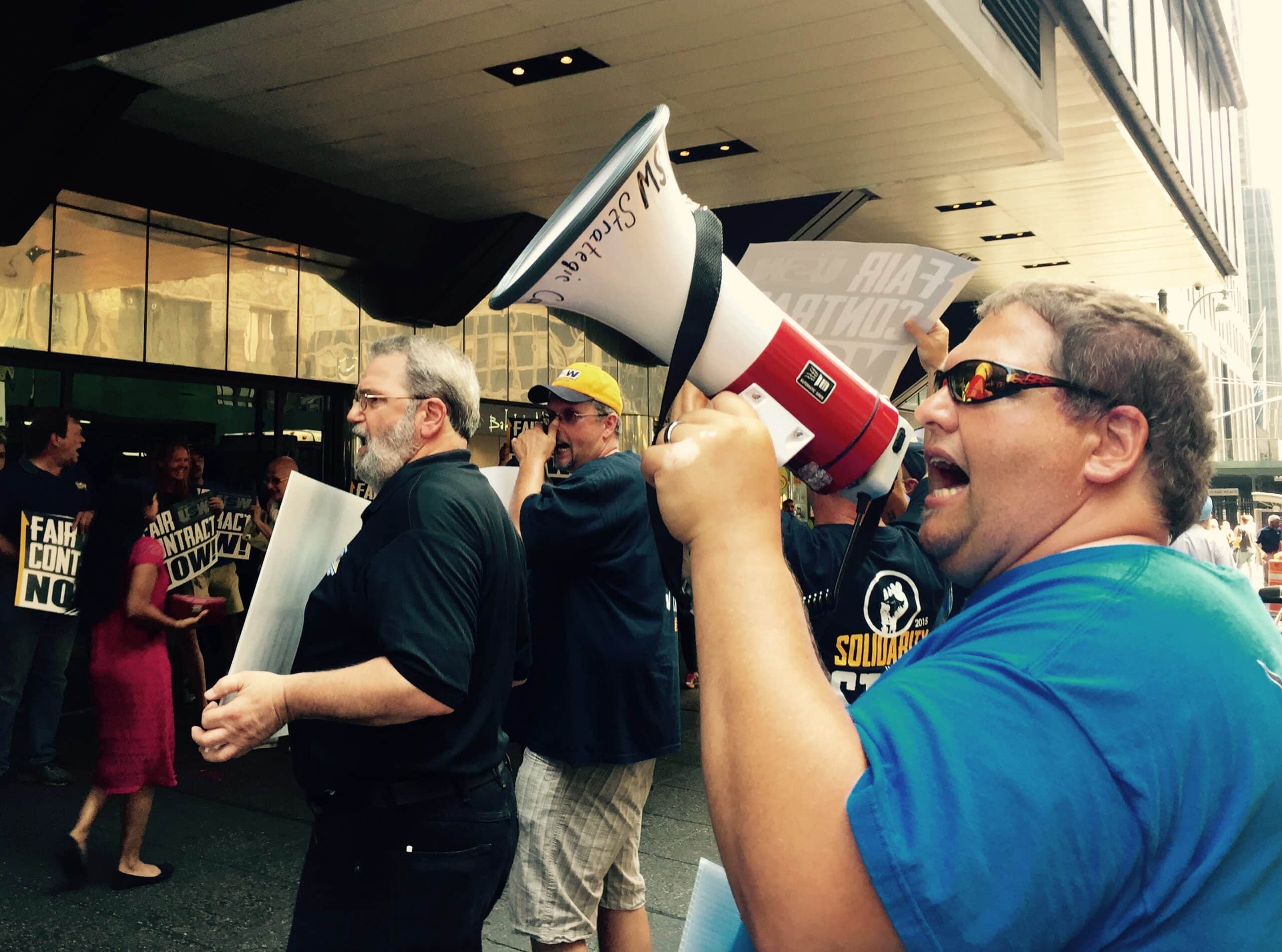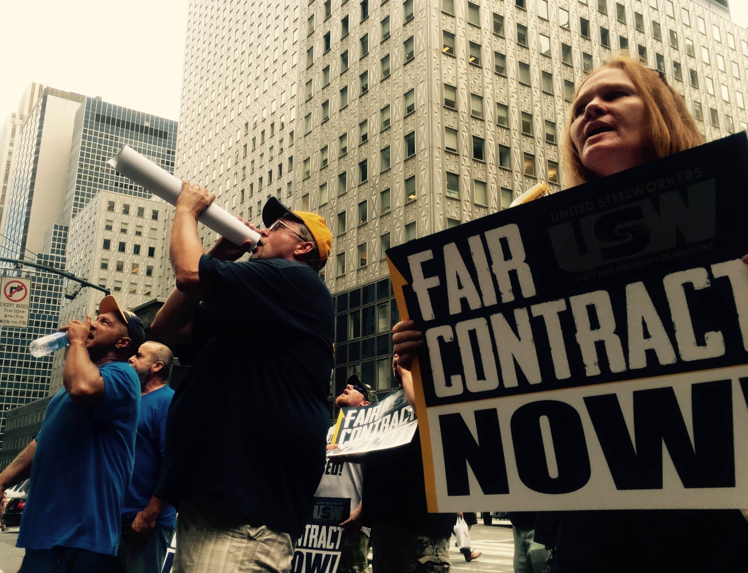 Steelworkers and supporters traveled from as far as Ohio, Pennsylvania, Upstate New York, Connecticut and Massachusetts to demonstrate in front of the conference. Chants of “What do we want? Fair contract!” could be heard over the Gabelli Company’s live webinar broadcast of the conference. Meanwhile a Steelworker activist was able to gain entry to the conference and confront ATI Vice President Dan Greenfield during the ‘question and answer’ session of the company’s presentation. When asked about the financial risks associated with paying inexperienced replacement workers as much as $150,000 per year to operate its facilities, Greenfield stuttered and then admitted that he couldn’t answer the questions.