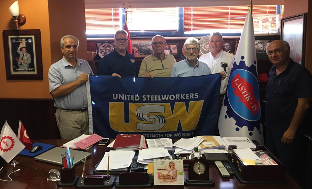 Pictured: (L-R) ihsan Malkoç, secretary general of Lastik-i_; Kent Holsing; Alaadin Sari, president of Lastik-i_; Ben Davis; Doug Watts, USW BASF Group chairman, and a Lastik-i_ member.