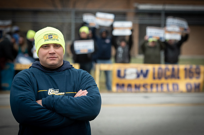 Pictured: John Tate, a Materion worker and organizer stands in front of a plant gate rally to encourage his coworkers to vote yes on January 15, 2020.
