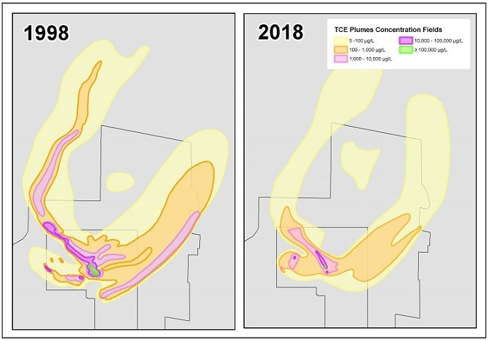 To date, the site has treated about 4.4 billion gallons of water—an amount equivalent to filling 6,500 Olympic-sized swimming pools. As of early 2020, the pump-and-treat systems removed more than 4,100 gallons of TCE from local groundwater.