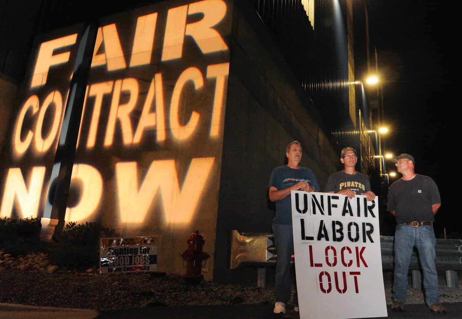 At midnight on August 15th, as the lockout got underway, members of USW Local 1196 in Brackenridge shined a light on ATI’s corporate greed, projecting “Fair Contract Now” above picket lines in front of the company’s new HRPF building.