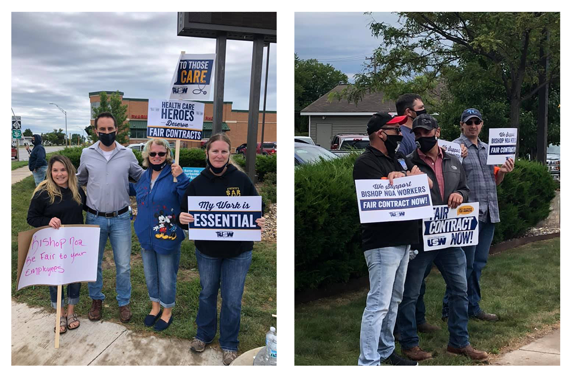Workers of the Bishop Noa Home in the shoreline city of Escanaba, Mich., gathered in both the sun and rain for an informational picket last Wednesday, August 17. The caregivers’ goal was to raise awareness about their need for a contract after voting to join United Steelworkers Local 2-21 two years ago.
