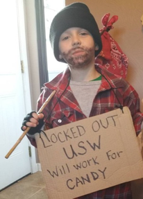 While most kids wanted to dress up as monsters or their favorite super heroes for Halloween, Caleb saw the holiday as an opportunity to spread the word about the lockout and build community support. This Steelworker kid put on a sign saying ‘Locked Out USW Member. Will Work for Candy,’ and dressed as a locked out union member for Halloween.  Caleb’s dad Don Coy is a locked out member of USW Local 1138 from Bagdad, PA.
