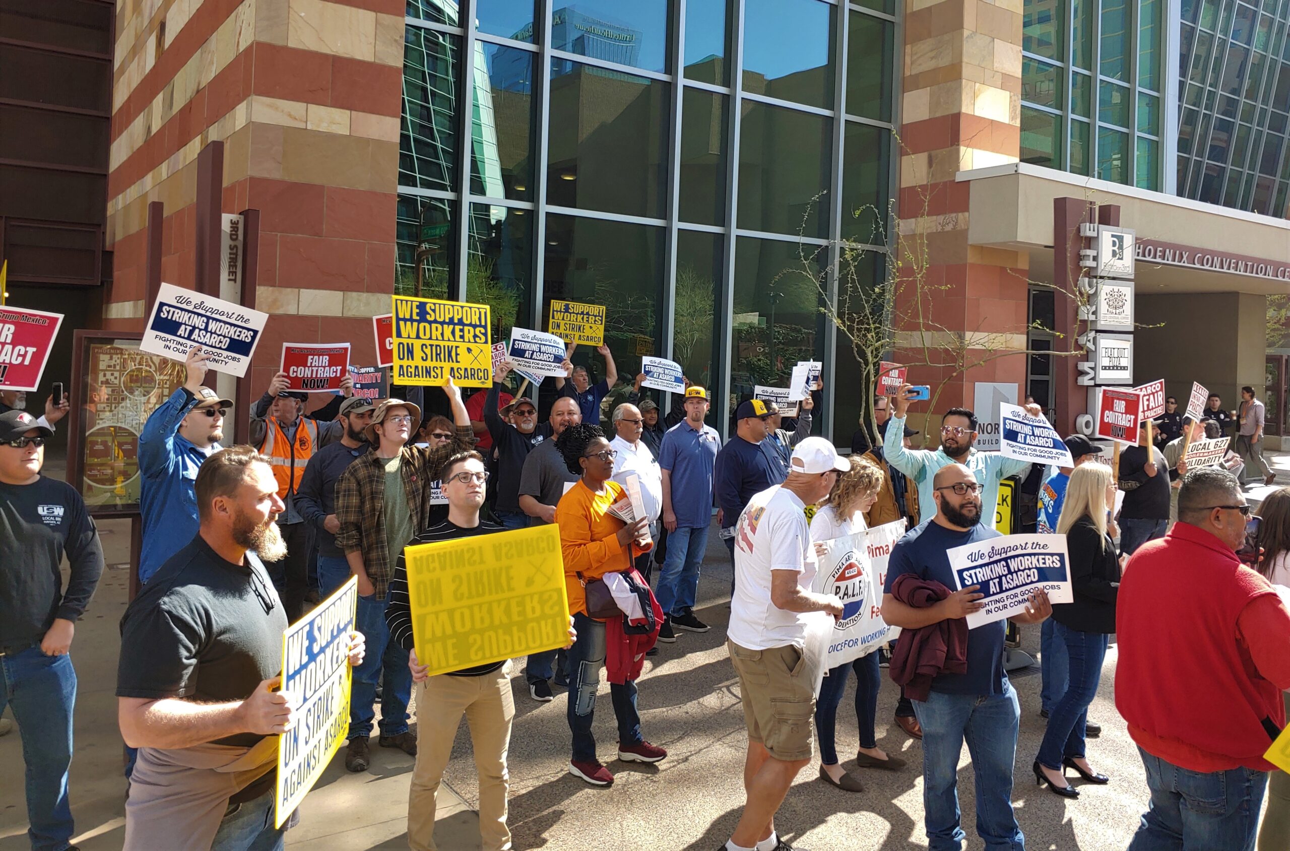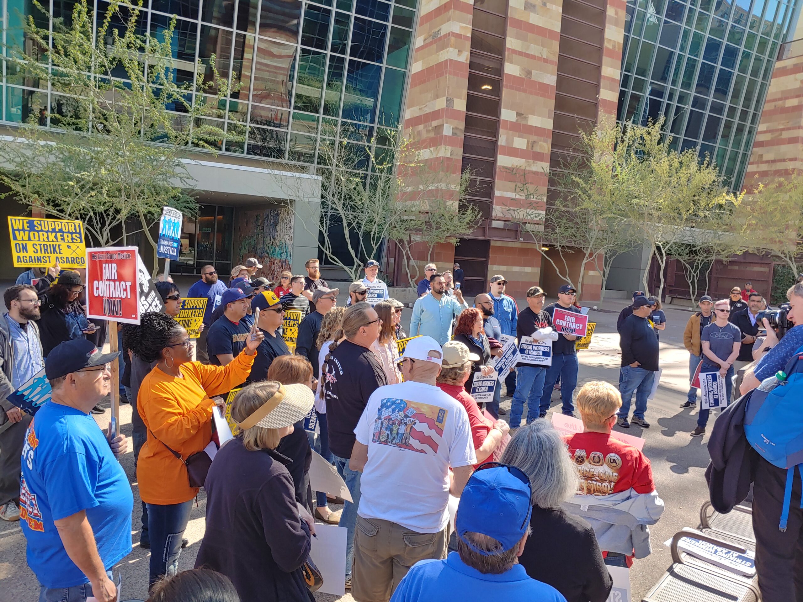 At the conference, they distributed thousands of handbills about our ongoing unfair labor practice strike, marched and chanted with allies from Tucson Jobs with Justice, CWA Locals 7050 & 7019, Arizona Alliance for Retired Americans, IATSE 336, UFCW Local 99, Maricopa Area Labor Federation, Pima Area Labor Federation, Arizona AFL-CIO and Healthcare Rising Arizona.