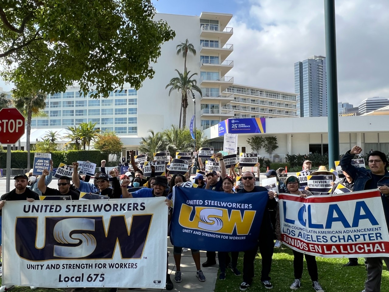 Several members of Local 7600 were in attendance and joined the Chevron refinery workers in a rally on May 4 in Beverly Hills as they entered their sixth week of a strike.