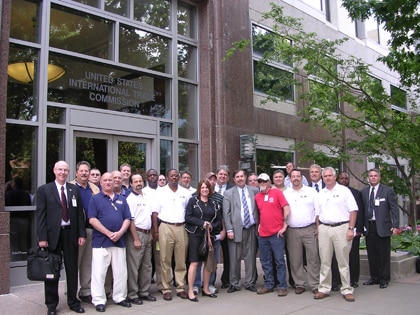 USW local union leaders representing workers who produce consumer tires at Goodyear, BF Goodrich/Michelin; and Bridgestone-Firestone, gathered at the end of a day-long public hearing at the U.S. International Trade Commission (ITC) in Washington, DC.  Standing with the tire workers are Leo Gerard, International President; Stan Johnson, International Secretary-Treasurer; Tom Conway, International Vice President. (Missing in this photo and testifying at the hearing was Ron Hoover, retiring International Executive Vice President).
