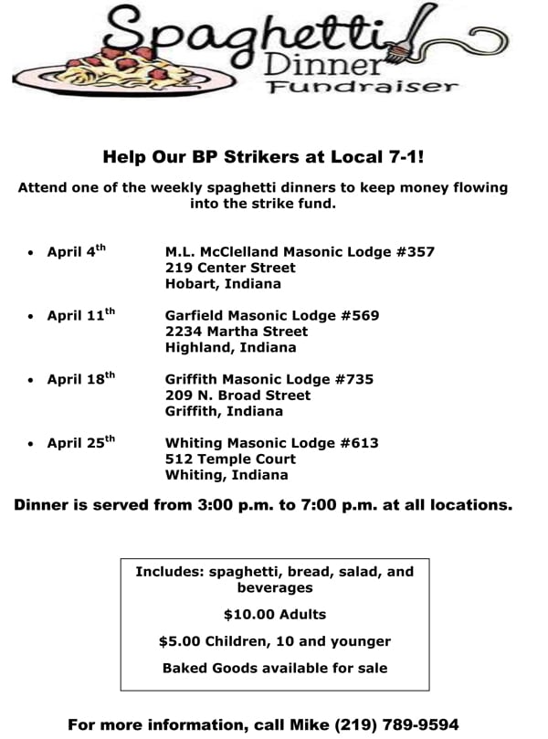 Spaghetti Dinner Fundraiser – Help Our BP Strikers at Local 7-1