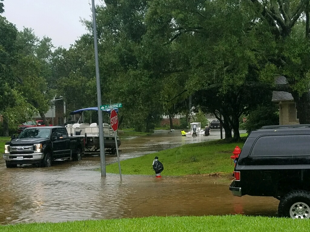 That morning, he drove to a neighborhood in hard-hit Dickinson, where nearly every house was flooded. He found hurricane refugees walking through deep water carrying plastic garbage bags of belongings over their heads. This is dangerous because people can step in the wrong place and suddenly slip under water. That’s because there were deep ditches on both sides of the road and floods push manhole covers off.